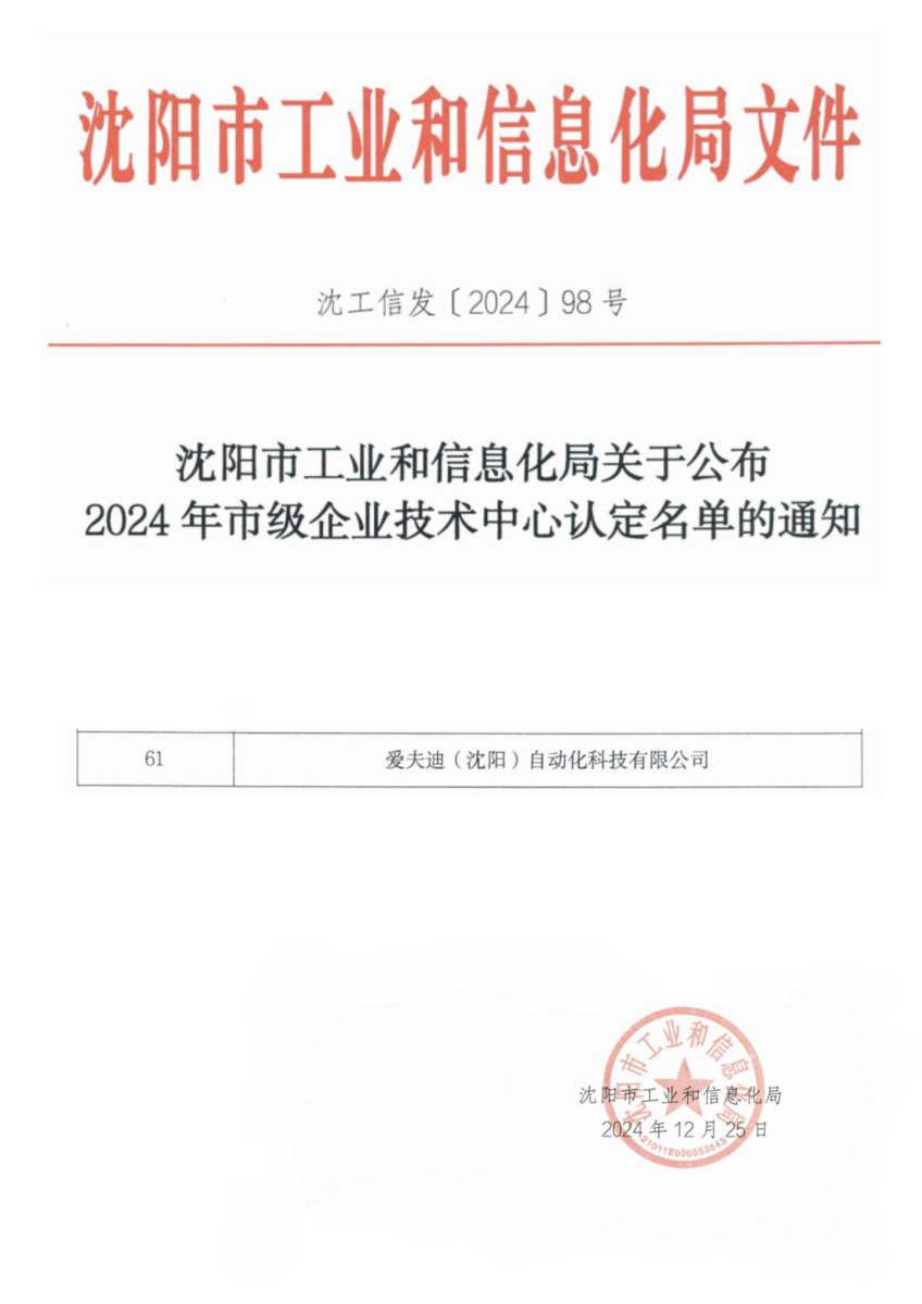 Recently, the ShenyangBureau of Industry and Information Technology announced the results of the 2024Shenyang Municipal Enterprise Technology Center certifications. FFT (Shenyang)Automation Technology Co., Ltd. (hereinafter referred to as “FFT Shenyang”) hasbeen awarded the title of “Shenyang Municipal Enterprise Technology Center.”This recognition marks another significant milestone for FFT Shenyang,following its achievements as a “High-Tech Enterprise” and a “Specialized,High-End and Innovation-Driven SME.” It reflects the widespread recognition ofthe company’s innovation capacity and growth potential in the industrialautomation sector.