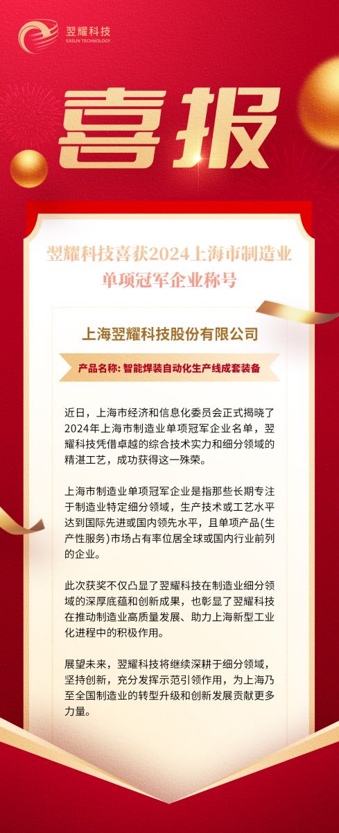 翌耀科技喜獲2024上海制造業單項冠軍企業稱號